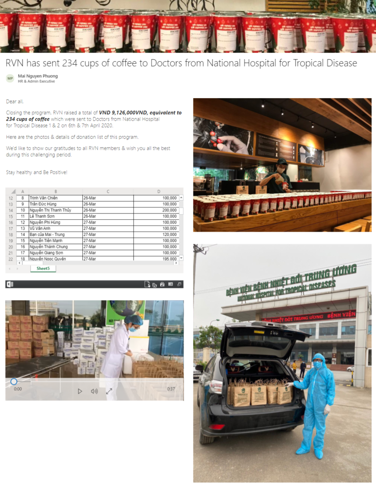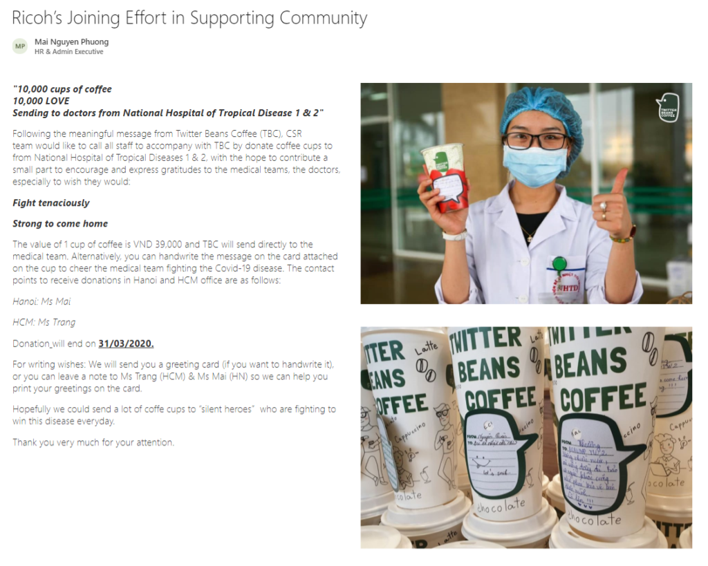 Ricoh Vietnam partnered with Twitter Beans Coffee on a campaign to send cups of coffee along with VND 39,000 (c. USD 1.65) per cup to the National Hospital of Tropical Diseases in Hanoi and Ho Chi Minh cities. The collaboration contributed VND 9,126,000 (USD 386) and 234 cups of coffee between March 28 and 31. Additionally, messages of thanks and appreciation to the doctors, nurses and staff could be attached to each cup.